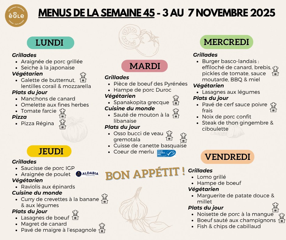 Chaque semaine, le restaurant Éole Andrée Dupeyron propose un menu varié, préparé sur place avec des produits frais, de saison et majoritairement locaux.